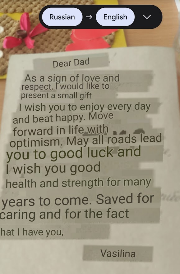 Tanya and Vaselina made special cards for Joanne and me. I’ll leave this here (excuse the “ransom note” effect that Google Translate offered as the closest English version of my card!).