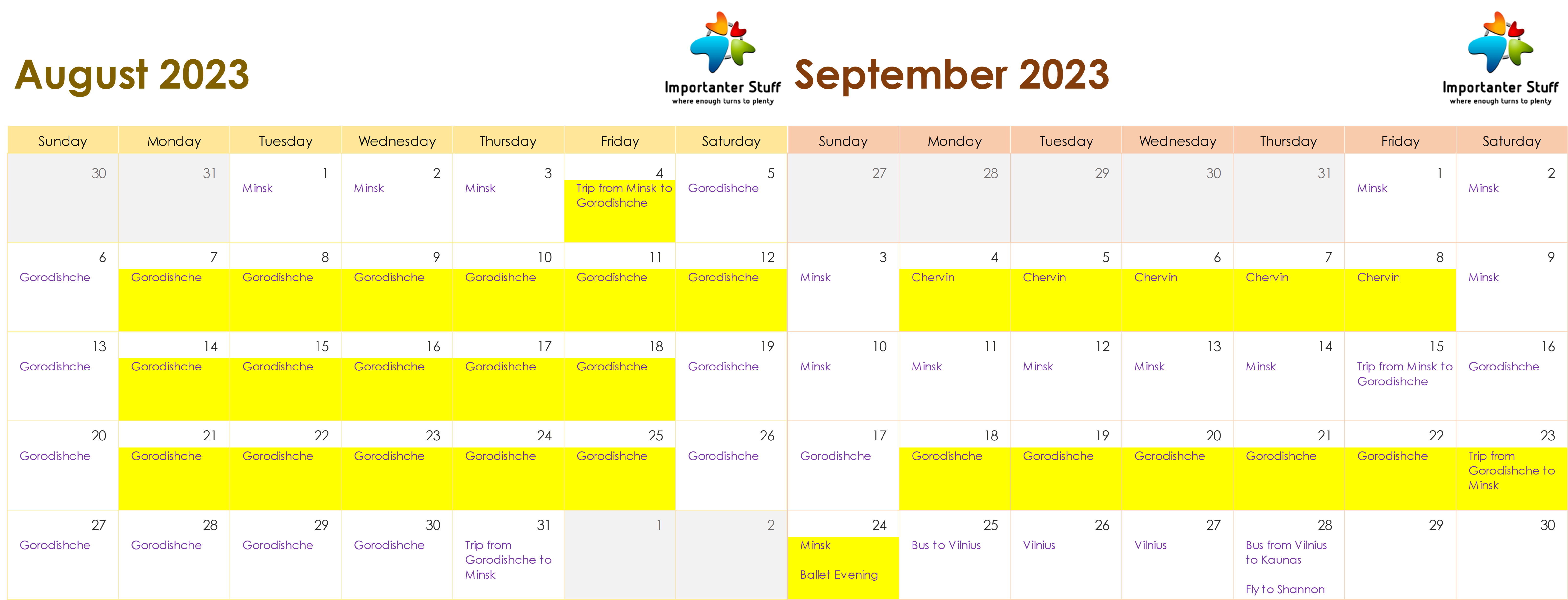 We came to Belarus with a rough idea of where we would be, and when. There were a few things that might have materialised, but these are still unknown. Rather than leaving it to the gods, we’ve set a calendar for the full stay that will see us between Gorodishche, Minsk, and Chervin until our return in late September.