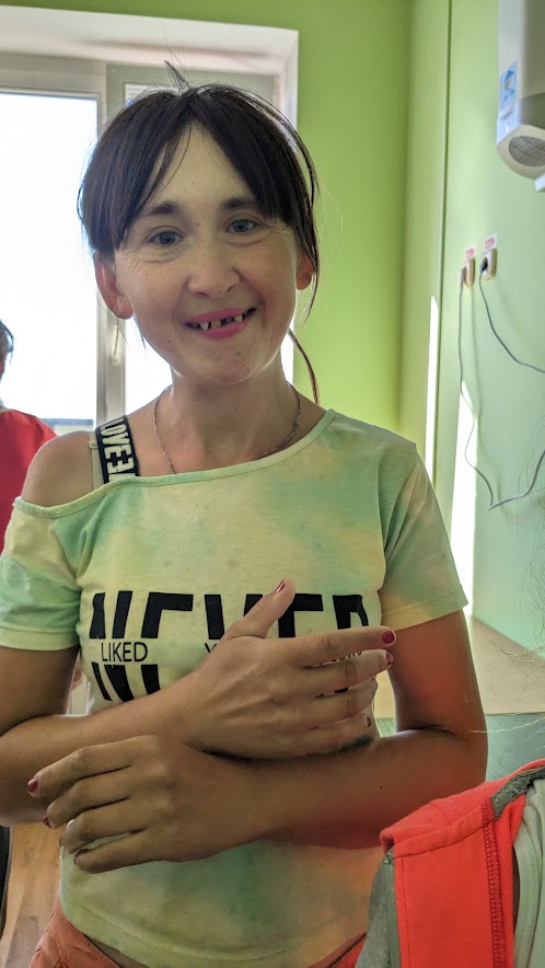 There is a young lady in this group that Joanne and I mistake for one of the mamas, we see her on one of the visits speaking with Irina. I guess that she is in her late 20s or early 30s and looks like she should be working there. How first impressions can be deceiving! On a subsequent visit to this group on the veranda, we see her cuddling her favourite blanket and opening her carefully clutched copybook to get the lyrics to the song that she chooses to sing for us.